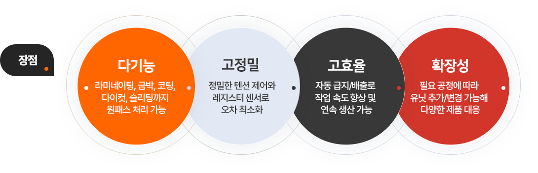 • 인쇄된 라벨·스티커 원단을 라미네이팅, 다이컷, 슬리팅, 제거지 배출 등 후가공 공정을 연속으로 처리하는 복합 가공 설비
